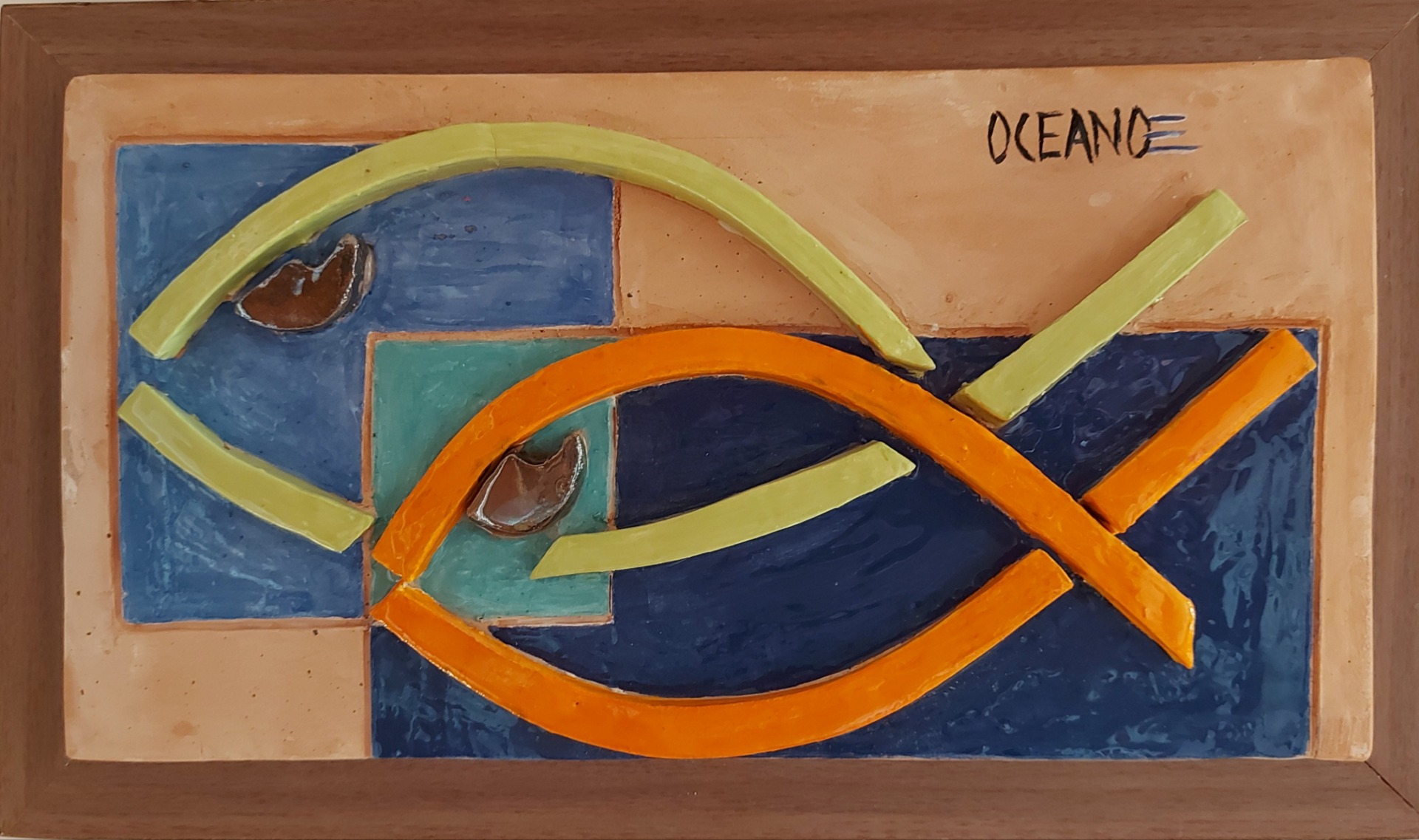 Oceano: altorilievo in ceramica con smalto ad ingobbio (dim.39x23)